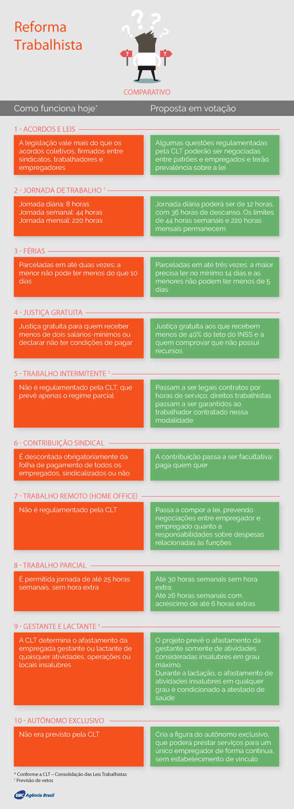A proposta de reforma trabalhista prevê, além da supremacia do negociado sobre o legislado, o fim da assistência obrigatória do sindicato na extinção e na homologação do contrato de trabalho. Além disso, acaba com a contribuição sindical obrigatória de um dia de salário dos trabalhadores. Há também mudanças nas férias, que poderão ser parceladas em até três vezes no ano,  além de novas regras para o trabalho remoto, também conhecido como home office. Para o patrão que não registrar o empregado, a multa foi elevada e pode chegar a R$ 3 mil. Atualmente, a multa é de um salário-mínimo regional.