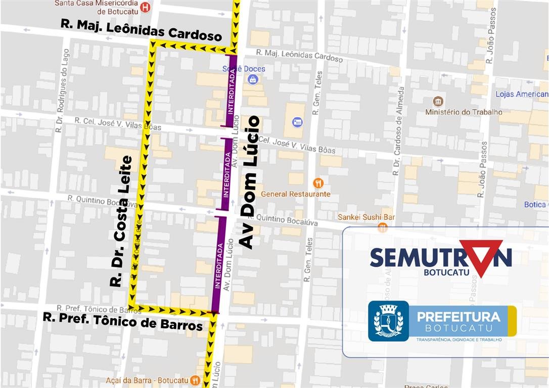 A Avenida Dom Lúcio estará parcialmente interditada nesta quarta-feira, 16, das 5h30 às 10 horas da manhã, no trecho compreendido entre as Ruas Major Leônidas Cardoso e Prefeito Tonico de Barros, no sentido Catedral – Cemitério. A interdição ocorre para que a Sabesp realize reparo em um vazamento invisível na rede de abastecimento. No sentido oposto, Cemitério – Catedral, o trânsito estará liberado.