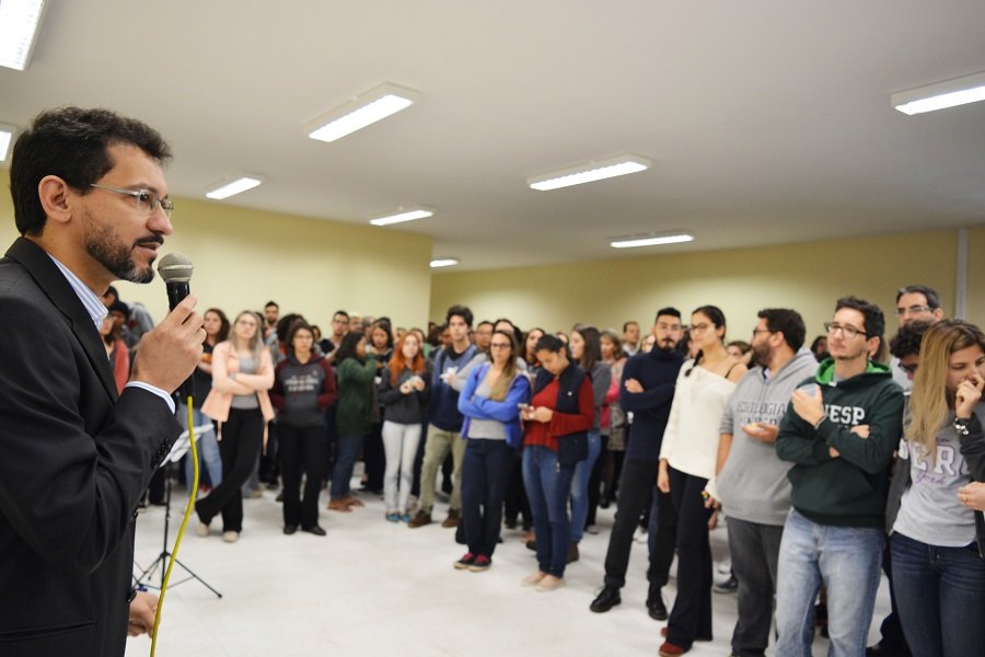 Diretor do IBB, César Martins, durante discurso para a comunidade acadêmica do instituto