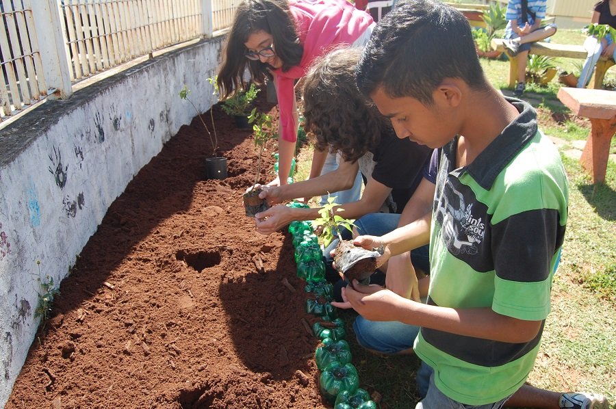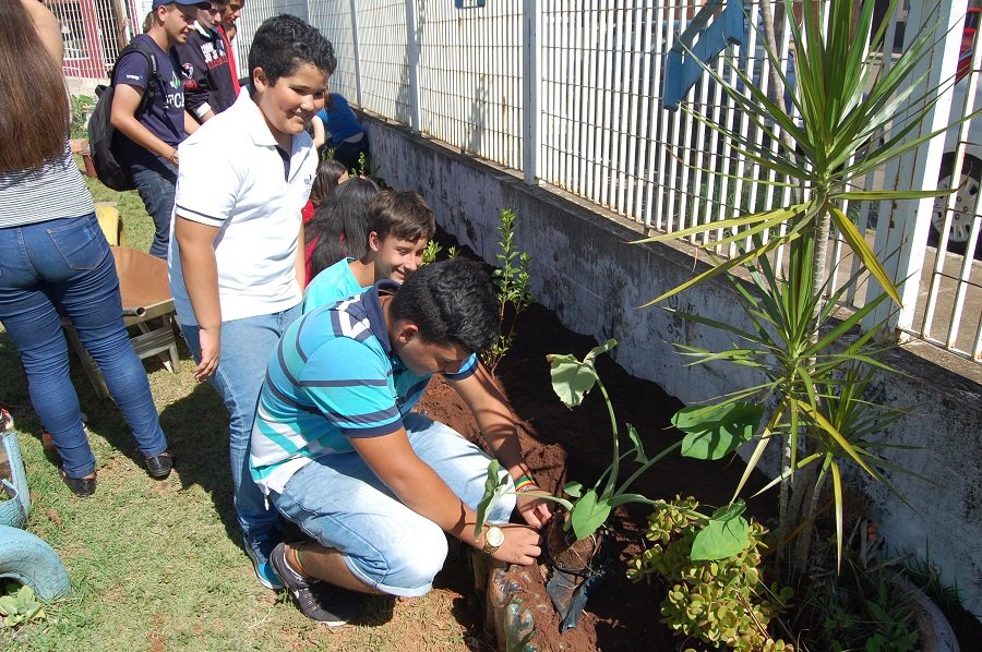 Com a participação entusiasmada dos alunos do 7º ano da escola e o apoio da equipe das Fazendas de Ensino, Pesquisa e Extensão da FCA, foram preparados novos canteiros circundados por garrafas pet e realizado o plantio de diversas mudas de plantas ornamentais.