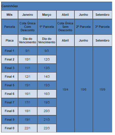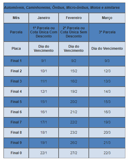 O proprietário tem até a data de vencimento da placa (veja tabela) para quitar o imposto em cota única, com desconto, ou pagar a primeira parcela do tributo.