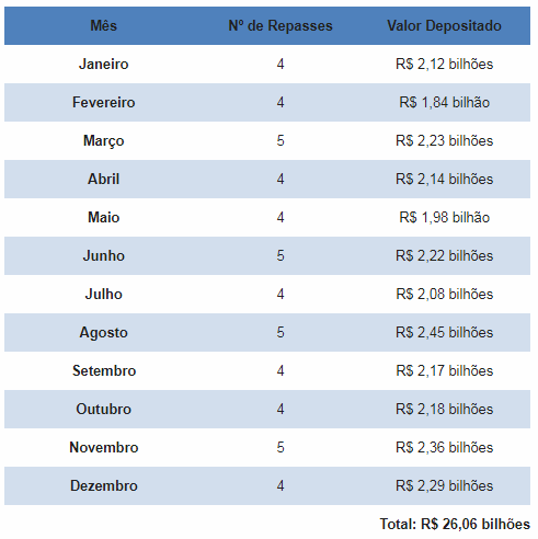 Em 2017, o governo de São Paulo realizou 52 depósitos e repassou às prefeituras do Estado o total de R$ 26,06 bilhões. O valor é superior aos R$ 24,78 bilhões repassados em 2016, também em 52 depósitos.