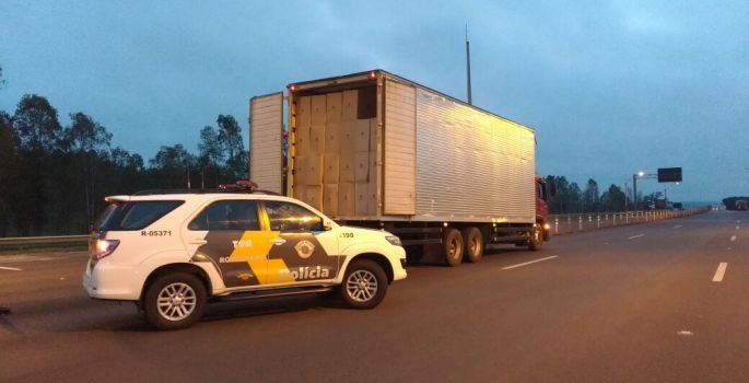 Após busca pessoal e veicular, a equipe constatou indícios de adulterações no chassi, etiquetas autodestrutíveis, plaqueta do bloco de motor e constatou também indícios de adulterações no CRLV (Documentos do caminhão) apresentado pelo condutor, sendo que, após verificação, a Equipe chegou ao veículo de placas Ponta Grossa/PR, este com queixa de furto no mesmo município.
