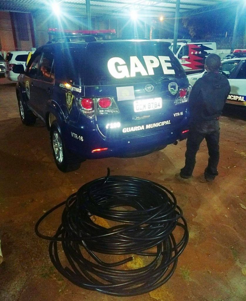 O Grupo de Ações Preventivas Especiais (GAPE), da Guarda Civil Municipal, surpreendeu um homem furtando cabos telefônicos na Rodovia Gastão Dal Farra, próximo ao Residencial Cedro, durante a madrugada desta terça-feira, 17. Os guardas Nogueira, De Santi e Marcos faziam o patrulhamento preventivo quando avistaram o homem com uma carriola improvisada em atitude suspeita, ao lado de um poste.