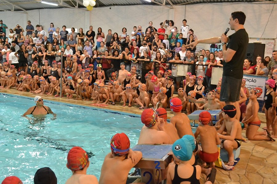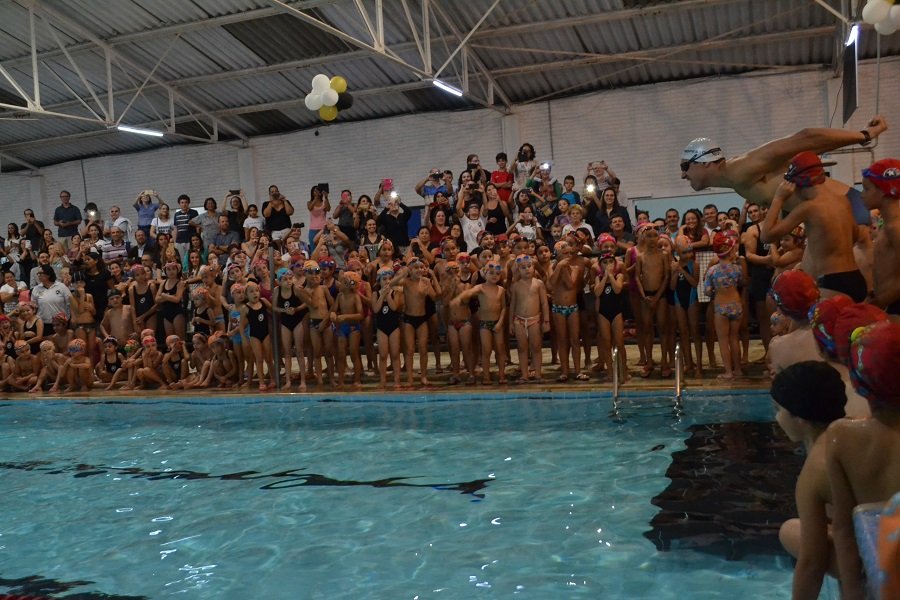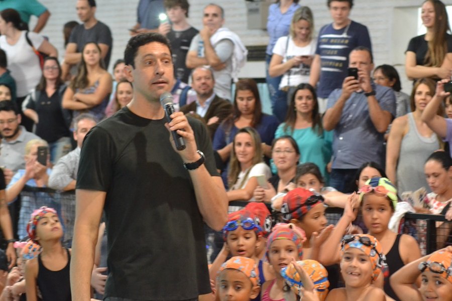 Um dos mais vitoriosos atletas brasileiros, o nadador Gustavo Borges foi a grande estrela na noite desta quinta-feira, 19, nas piscinas da Associação Atlética Botucatuense. A visita integrou as celebrações de cem anos do clube. Mais de 500 pessoas compareceram ao evento, onde puderam conhecer o ídolo da natação. Desse total, mais de 250 crianças das escolinhas do clube literalmente pularam nas piscinas aquecidas com o medalhista olímpico.