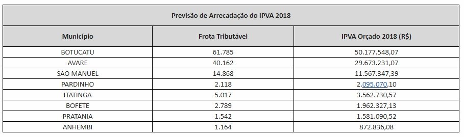 Na região, o IPVA rendeu R$ 14.099.124,15 em 27.498 veículos tributados. São Manuel registrou receita de R$ 7.798.615,34, sendo que R$ 9.135,64 foram por créditos da Nota Fiscal Paulista. Itatinga aparece na sequência, com a geração de R$ 2.318.767,92 por meio do imposto, sendo que R$ 2.095,87 foram abatidos da NFP.