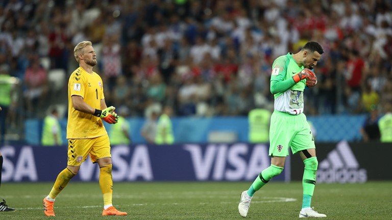 As duas primeiras cobranças foram defendidas pelos goleiros da Croácia e da Dinamarca. Na quarta cobrança, Subasic evita o gol dinamarquês. A Croácia também desperdiça: Schmeichel faz uma excelente defesa. Na quinta cobrança dinamarquesa, Subasic voltou a defender.