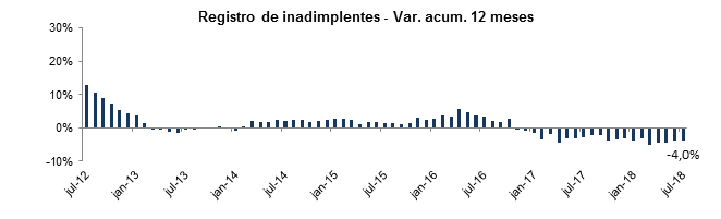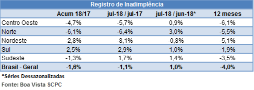 A inadimplência do consumidor caiu 4,0% no acumulado em 12 meses (agosto de 2017 até julho de 2018 frente aos 12 meses antecedentes), de acordo com dados nacionais da Boa Vista SCPC. Na comparação mensal com ajuste sazonal, julho apresentou variação positiva de 1,0% frente a junho. Quando comparado o resultado contra o mesmo mês de 2017, o indicador caiu 1,1%.