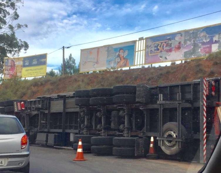 Motorista do caminhão perdeu o controle e o veículo tombou. Não houve vítimas