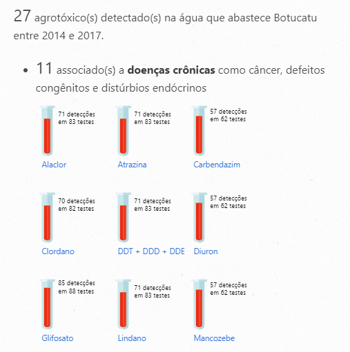 A reportagem mostra a quantidade de agrotóxicos encontrados nos testes e quantas vezes foram detectados nos exames em Botucatu. Foram citados pesticidas que causam doenças crônicas, como câncer e distúrbios endócrinos: Alaclor, Atrazina, Carbendazin, Clordano, Glifosato, Lindano, Mancozebe, Permetrina, DDT+DDD+DDE, Diuron e Trifluralina.