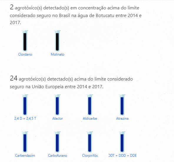 Dos 27 agrotóxicos detectados em Botucatu, dois apresentam concentração acima do limite considerado seguro no Brasil na água de Botucatu: Clordano e Molinato. E outros 24 agrotóxicos foram detectados em quantidade acima do limite considerado seguro na União Europeia.