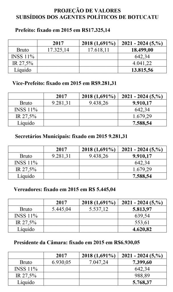Devido ao reajuste aprovado pela Câmara Municipal, as despesas com salários na esfera pública será de R$ 232.690 mensais. Esta valor passará a R$ 3.400.000 anuais, em média. Botucatu possui atualmente onze vereadores e catorze secretários. Estes últimos cargos vêm sendo reduzidos gradativamente pela atual gestão.