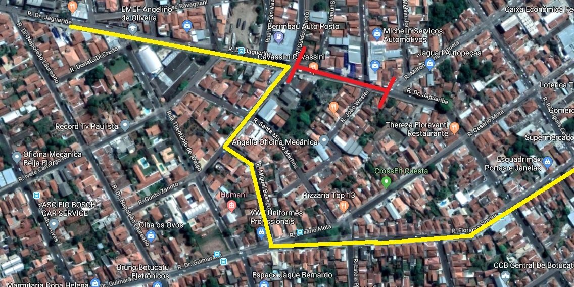 Por isso, o fluxo de veículos será desviado para vias alternativas. O transporte coletivo no sentido Bairro-Centro seguirá pelas ruas Guido Zanotto, Miguel Basseto, Floriano Simões, até a Major Matheus (veja o mapa).