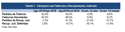 Já no acumulado em 12 meses (setembro de 2018 até agosto de 2019 em relação aos 12 meses anteriores), os pedidos de falência ainda recuam (-8,6%). Mantida a base de comparação, as Falências Decretadas, Pedidos de Recuperação Judicial e Recuperações Judiciais Deferidas também diminuíram (-8,3%, -15,1% e -11,9%, respectivamente).