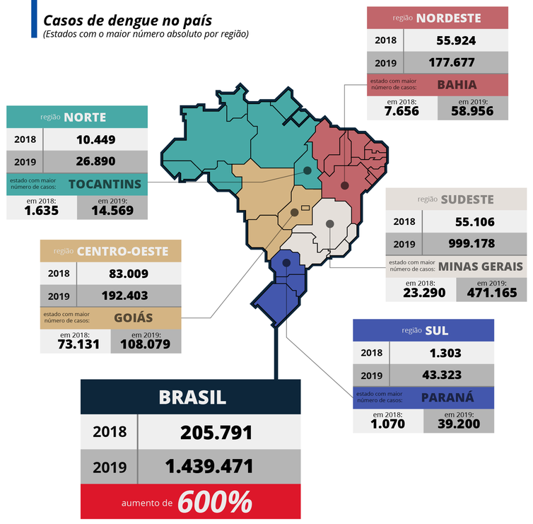 Também são destaque negativo no balanço Goiás (108.079 casos), Espírito Santo (59.318) e Bahia (58.956). Quando o critério é a variação por região do país, o quadro mais crítico se encontra no Sul (3.224,9%), que contrasta com o do Centro-Oeste (131,8%). Além disso, nota-se que apenas dois estados apresentaram queda na prevalência da dengue: Amazonas, que diminuiu o total de 1.962 para 1.384 (-29,5%), e Amapá, onde houve redução de 608 para 141 (-76,8%).