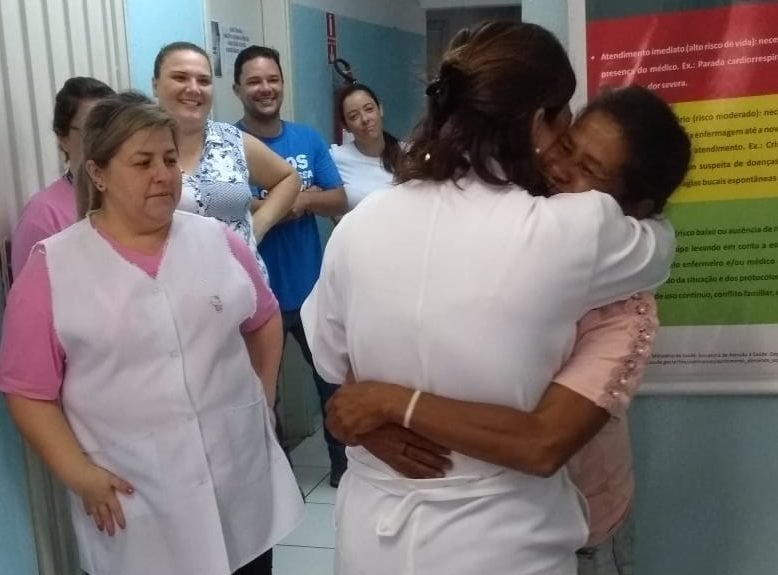 Dona Terezinha foi cercada e cumprimenta com muito amor e carinho por toda a equipe do PSF, que é comandada pela enfermeira Jacqueline Piovan.