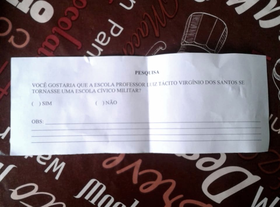 A possibilidade está sendo estudada pela comunidade do Jardim Flamboyant que, por meio de uma enquete distribuída neste sábado, 5 de outubro, durante evento no bairro, indaga sobre a implantação do modelo. No documento, obtido com exclusividade pelo Notícias Botucatu, está a pergunta: “Você gostaria que a escola Tácito Virginio dos Santos se tornasse uma escola cívico militar?”.