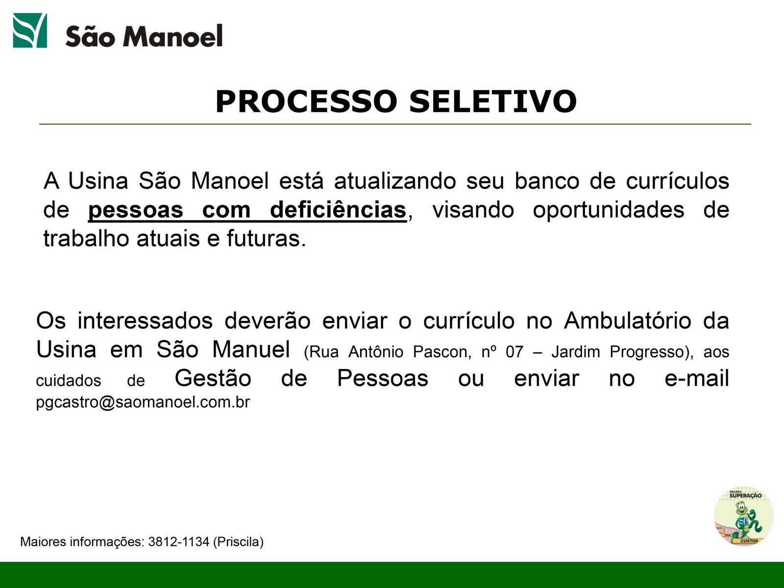 A usina de cultivo de cana-de-açúcar São Manoel comunica a abertura de oportunidades de trabalho para Pessoas Com Deficiência (PCD) disponíveis para seu complexo fabril, em São Manuel.