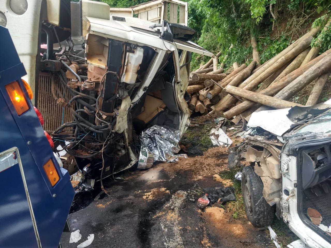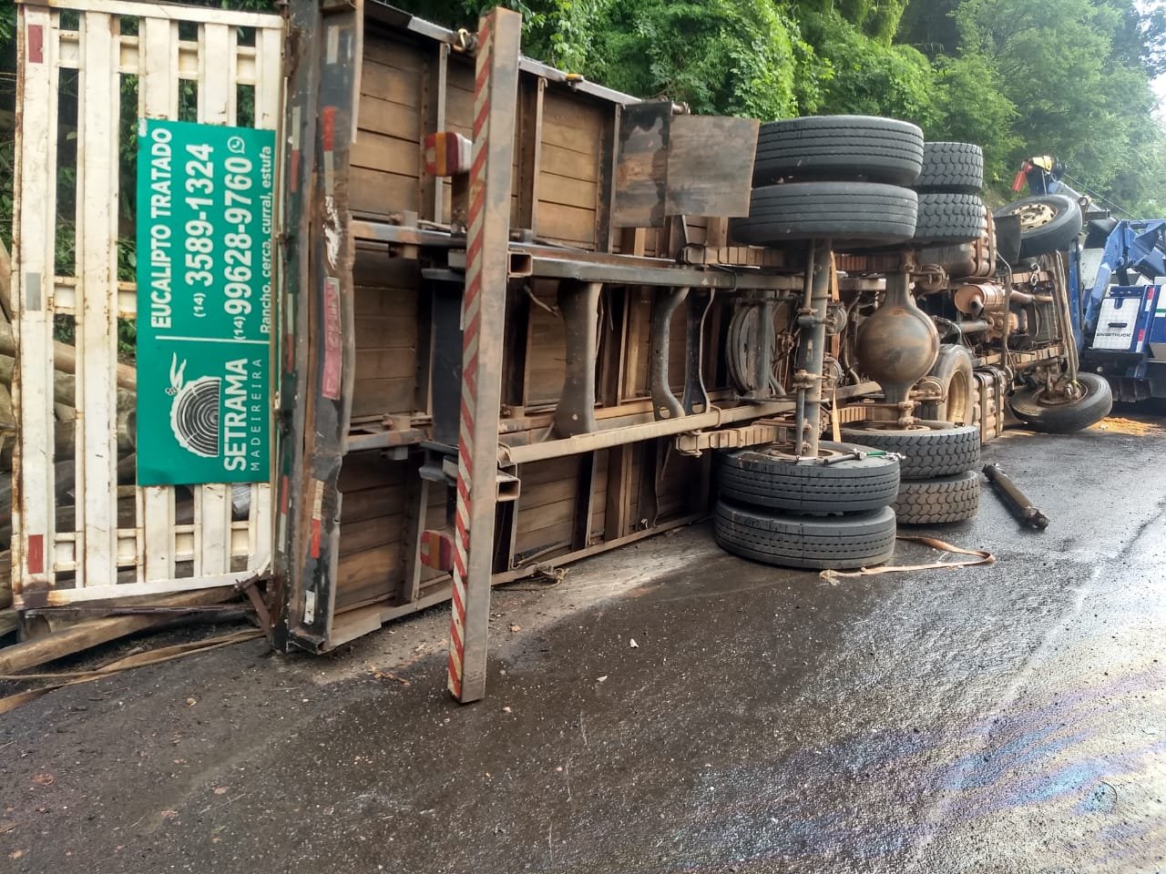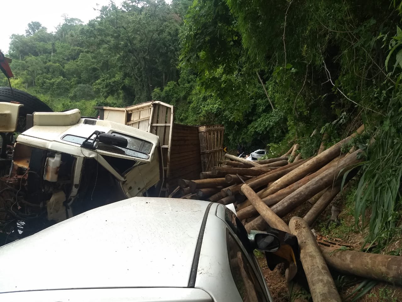 Por volta das 9h30 um caminhão Ford Cargo, com toras de madeira em sua caçamba, veio a perder os freios, fazendo com que o motorista não tivesse mais controle do veículo.