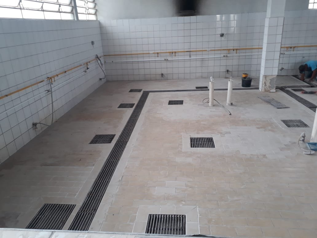 Durante as férias, período em que o preparo das refeições é menor, todo o piso da Cozinha Piloto foi substituído por um novo. A reforma serviu para adequar o sistema de drenagem e também trocar os ralos e grades. O investimento na obra foi de R$ 30.500,00, por meio de recursos próprios.