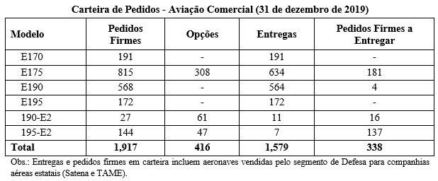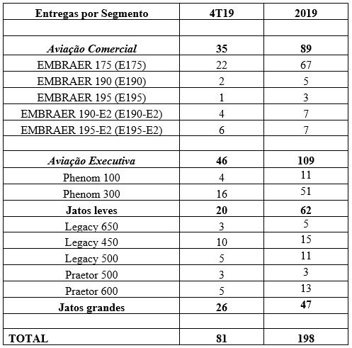 O volume de entregas tanto para a aviação comercial quanto para a aviação executiva ficou dentro das estimativas para 2019, de 85 a 95 jatos comerciais e de 90 a 110 de jatos executivos. No quarto trimestre de 2019 (4T19), a Embraer entregou 81 jatos, sendo 35 comerciais e 46 executivos (20 leves e 26 grandes). Em 31 de dezembro, a carteira de pedidos firmes a entregar totalizava USD 16,8 bilhões.