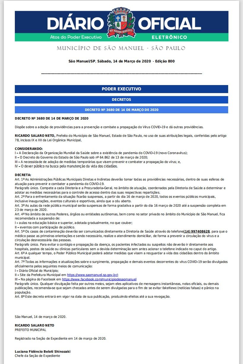 Decreto assinado pelo prefeito Ricardo Salaro e publicado neste sábado, 14 de março, no Diário Oficial do Municío traz algumas providências como a suspensão de eventos como inaugurações, eventos culturais e esportivos, mesmo que a céu aberto.