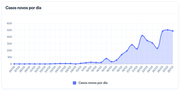 No balanço de ontem (27), o número de diagnosticados estava em 3.417, e o de mortes em 92 (taxa de letalidade de 2,7%). O número de casos registrados nas últimas 24 horas, portanto, soma 487.