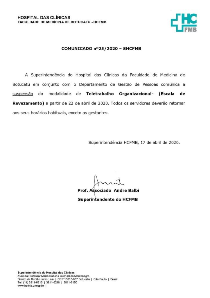 Uma das principais linhas de frente no combate ao novo coronavírus (Covid-19), o Hospital das Clínicas da Faculdade de Medicina de Botucatu (HCFMB) determinou nesta sexta-feira, 17 de abril, a suspensão das atividades a distância e revezamento de seus funcionários (teletrabalho). A medida vale para funcionários da Secretaria de Estado da Saúde, Unesp e da Fundação para o Desenvolvimento Médico e Hospitalar (Famesp) alocados na unidade.