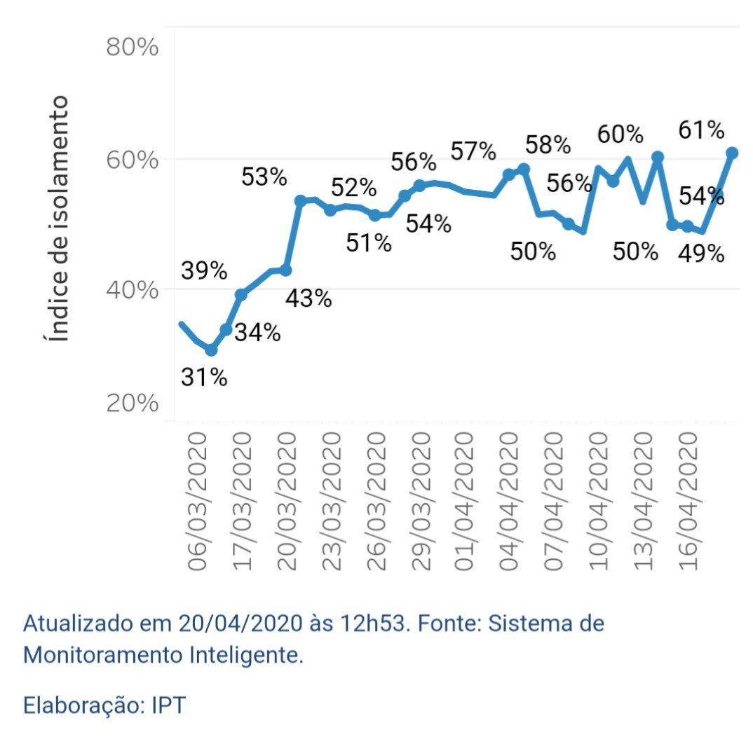 Os dados são do Sistema de Monitoramento Inteligente (SMI), usado pelo governo do Estado para acompanhar a evolução de isolamento em mais de cem municípios paulistas acima de 70 mil habitantes. As análises partem de dados fornecidos pelas operadoras de telefonia móvel quanto a movimentação dos telefones celulares.