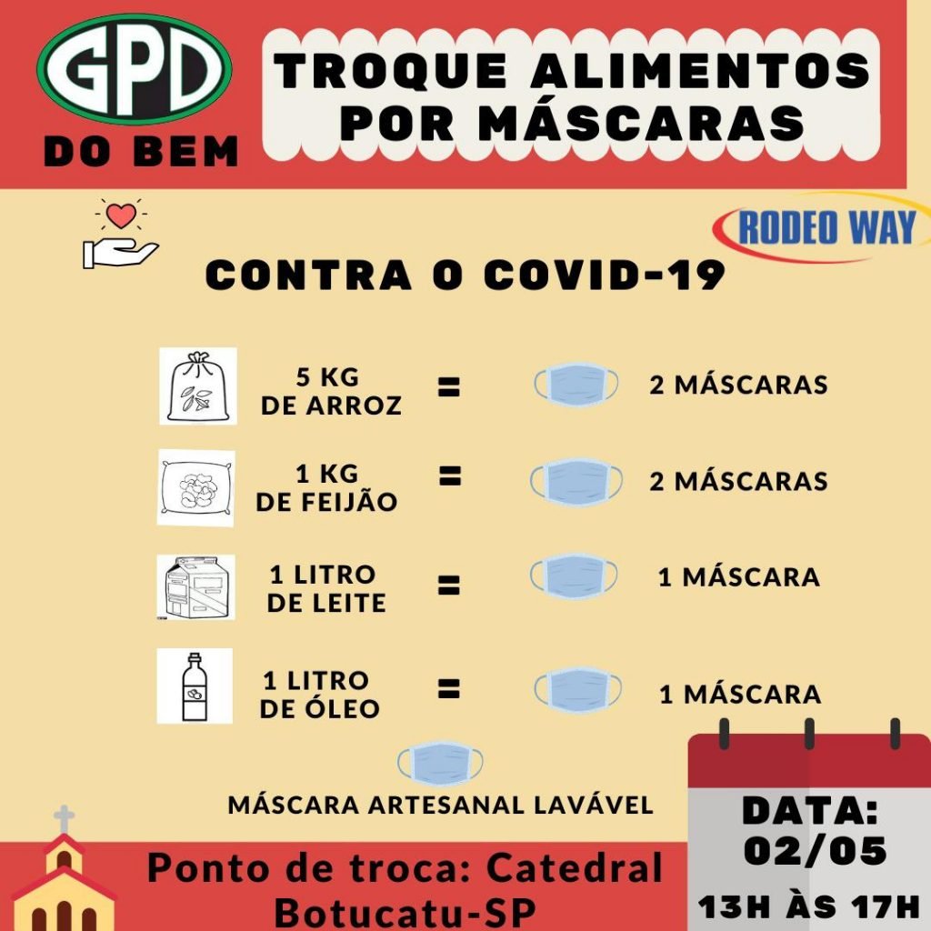 A ação ocorrerá no próximo sábado, 2 de maio, das 13 às 17 horas, no largo da Catedral. Poderão ser trocados um litro de óleo (vale uma máscara), um litro de leite (uma máscara), um quilo de feijão (duas máscaras) e cinco quilos de arroz (duas máscaras). Os alimentos serão revertidos a entidades assistenciais e/ou famílias em situação de vulnerabilidade.