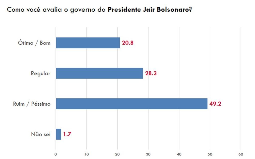 A avaliação negativa do governo Bolsonaro chegou a 49,2% de ruim/péssimo, superando a soma dos que o consideram regular (28,3%) e bom (20,8%). A avaliação positiva despencou 8 pontos percentuais em dois meses, enquanto a negativa subiu 13 pontos.