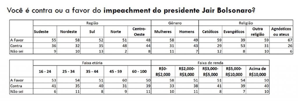Na média nacional, 54% dos entrevistados são a favor do impeachment de Bolsonaro. A região Nordeste tem o maior índice pró-impeachment, 58% a favor e 32% contrários. Depois vêm as regiões Sudeste (55% a 36%), Sul (52% a 35%), Norte (51% a 48%) e Centro-Oeste (48% a 44%).