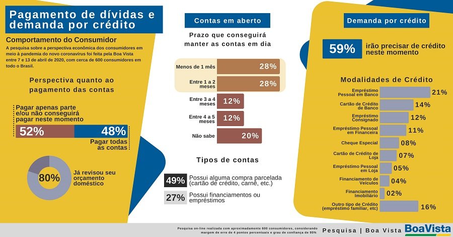 Incertos sobre o futuro da economia e de suas finanças, 59% dos consumidores entrevistados têm perspectiva de que talvez precisarão contratar crédito para pagar as contas durante ou após a pandemia. Outros 41% dizem que não irão precisar contratar crédito neste momento.