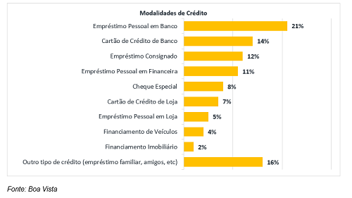 A principal modalidade citada pelos que afirmam ter de tomar crédito, seja durante seja depois da pandemia, foi o empréstimo pessoal em bancos (21%), seguida do cartão de crédito (14%) e do empréstimo consignado (12%). O gráfico a seguir ilustra todas as modalidades citadas: