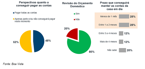 Perguntados sobre por quanto tempo acreditam conseguir manter as contas em dia, 56% responderam que no máximo por dois meses. Outros 12% afirmam ter fôlego entre três e quatro meses e 12%, para mais de quatro meses. 20% não sabem dizer até quando conseguem pagar. A imagem abaixo completa as informações: