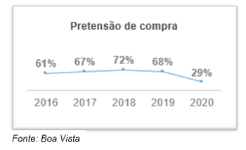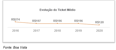 A queda no ticket médio, que já vinha sendo observada em anos anteriores, é mais acentuada em 2020, como também mostra a pesquisa da Boa Vista. Dos R$ 196 em 2019, o ticket médio em 2020 está na faixa dos R$ 120. Na imagem a seguir é possível observar a evolução:
