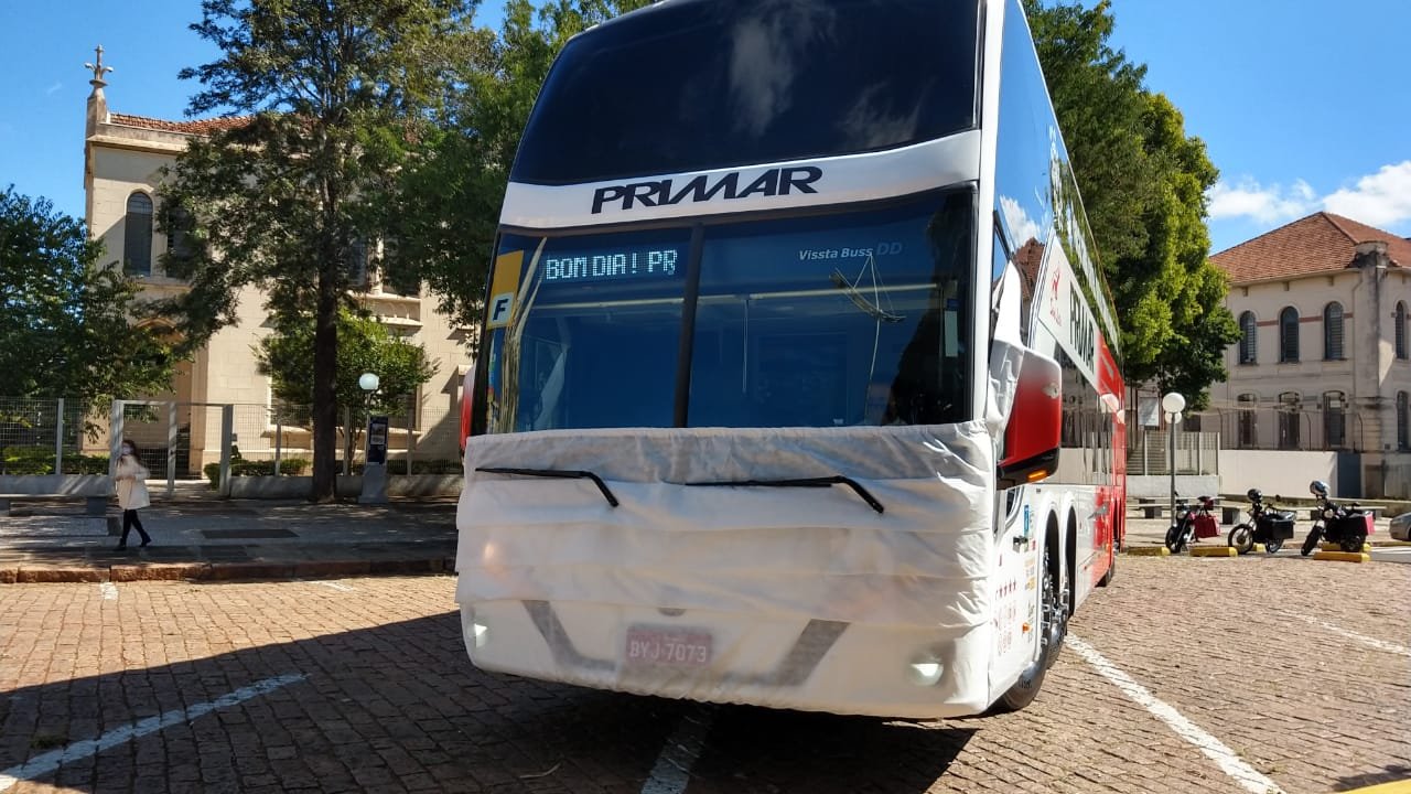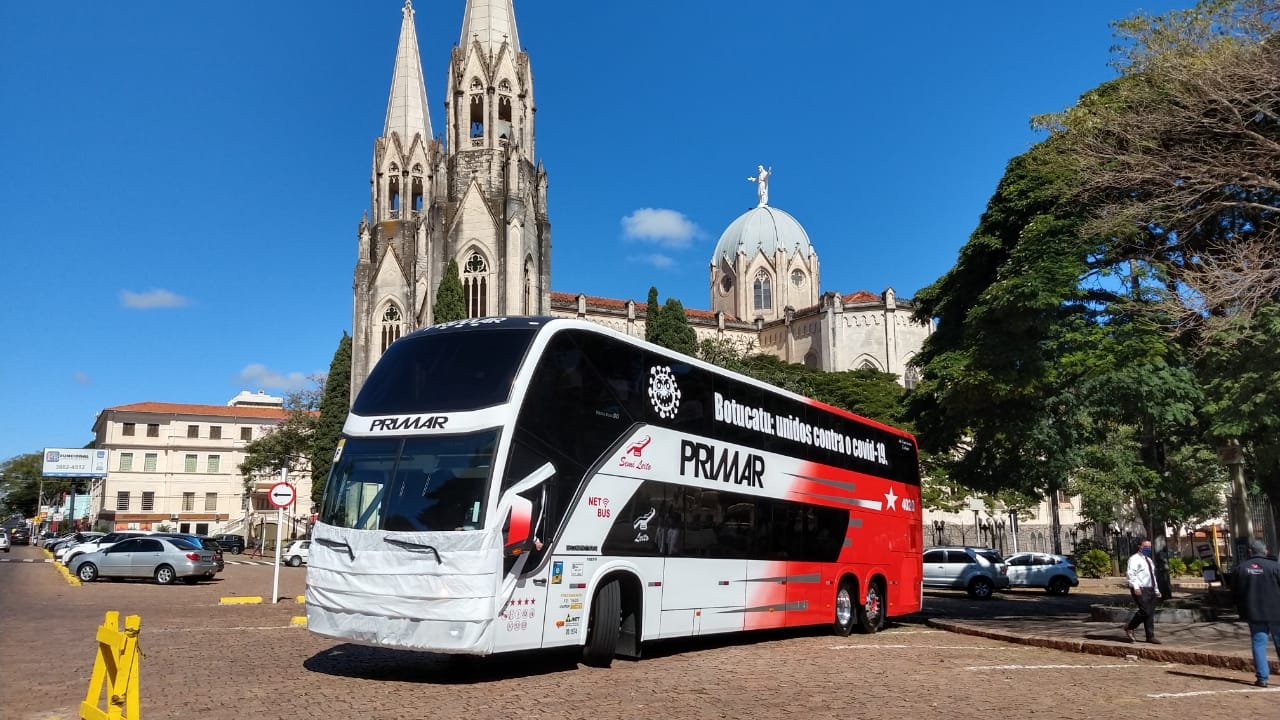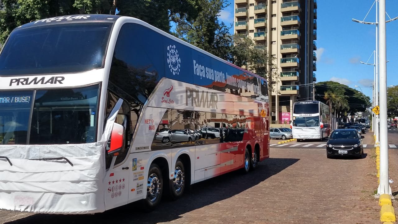 Iniciativa foi organizada pelo Primar Turismo que teve dois ônibus da frota estilizados com frases de alerta sobre a Covid-19. O que chamou a atenção foi a colocação de duas máscaras gigantes na parte frontal dos veículos, que ficaram estacionados em frente da Prefeitura Municipal, no largo da Catedral.