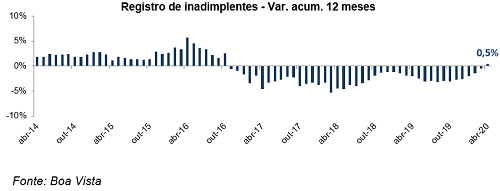De fato, além de registrar a segunda variação mensal positiva consecutiva, nota-se que em abril a análise acumulada em 12 meses passou para o campo positivo pela primeira vez desde outubro de 2016, movimento que deve permanecer durante o ano de 2020. Ademais, outros dados de mercado mostram que a inadimplência tende a crescer mais entre os consumidores de menor renda, exatamente os mais afetados pela queda da atividade econômica e piora no mercado de trabalho.