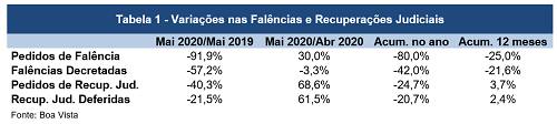 Os pedidos de falência avançaram 30% em maio, na comparação com abril, segundo dados com abrangência nacional da Boa Vista. Mantida a base de comparação, os pedidos de recuperação judicial e as recuperações judiciais deferidas aumentaram 68,6% e 61,5%, respectivamente. Por outro lado, as falências decretadas registraram queda de 3,3% na variação mensal.