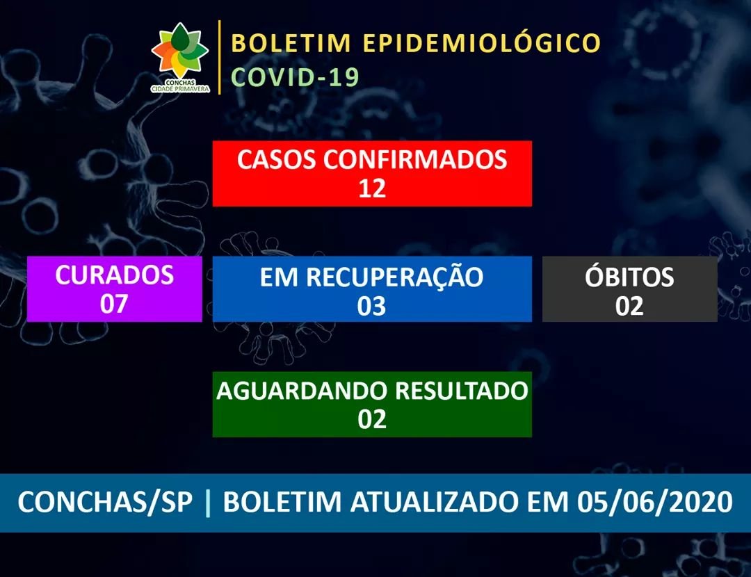 Conchas possui 12 casos confirmados do novo coronavírus desde o início da pandemia, sendo que sete conchenses foram curados. Ainda há três pessoas em recuperação e três ainda aguardando resultados dos exames.