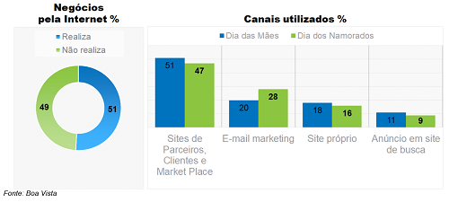 O estudo identificou que 51% das MPMEs já atuam com vendas pela internet. Sendo que para este Dia dos Namorados os canais que estão sendo utilizados pelos entrevistados, para atingir os consumidores, são os sites de fornecedores parceiros, clientes e market place (47%), e-mail marketing (28%), site próprio (16%) e anúncio em site de busca (9%). Como mostra a imagem abaixo: