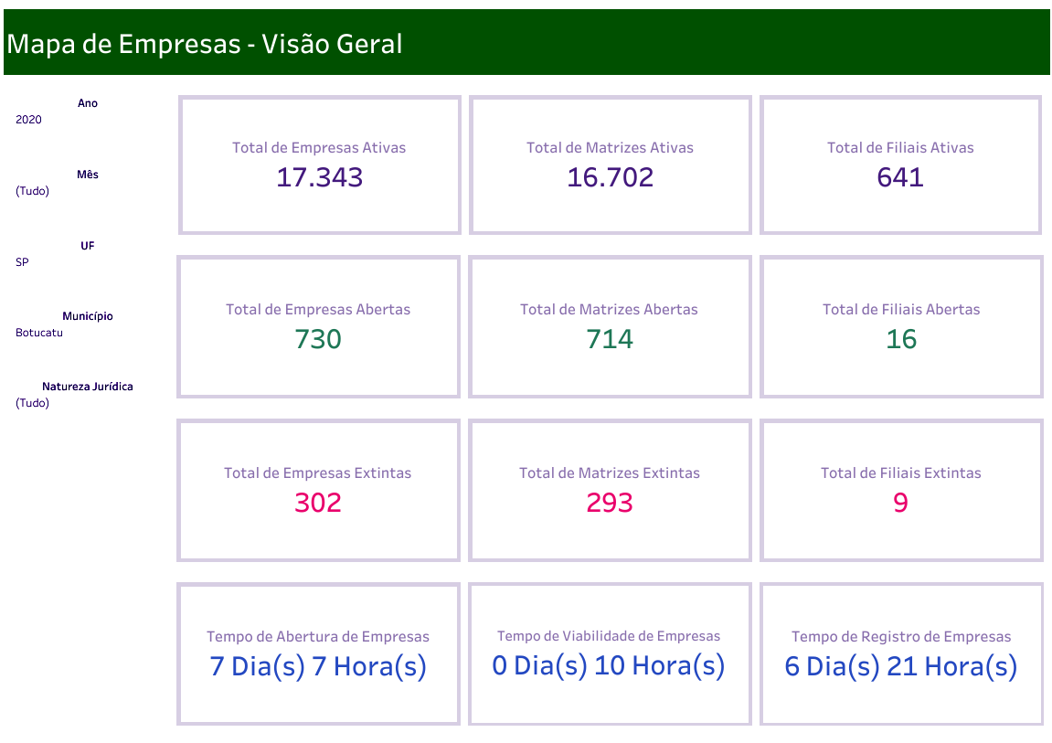 Segundo o painel, Botucatu possui, até março deste ano, 17.343 empresas ativas, sendo 16.702 matrizes abertas (aquelas cujas sedes são no próprio município), e 641 empresas filiais ativas.