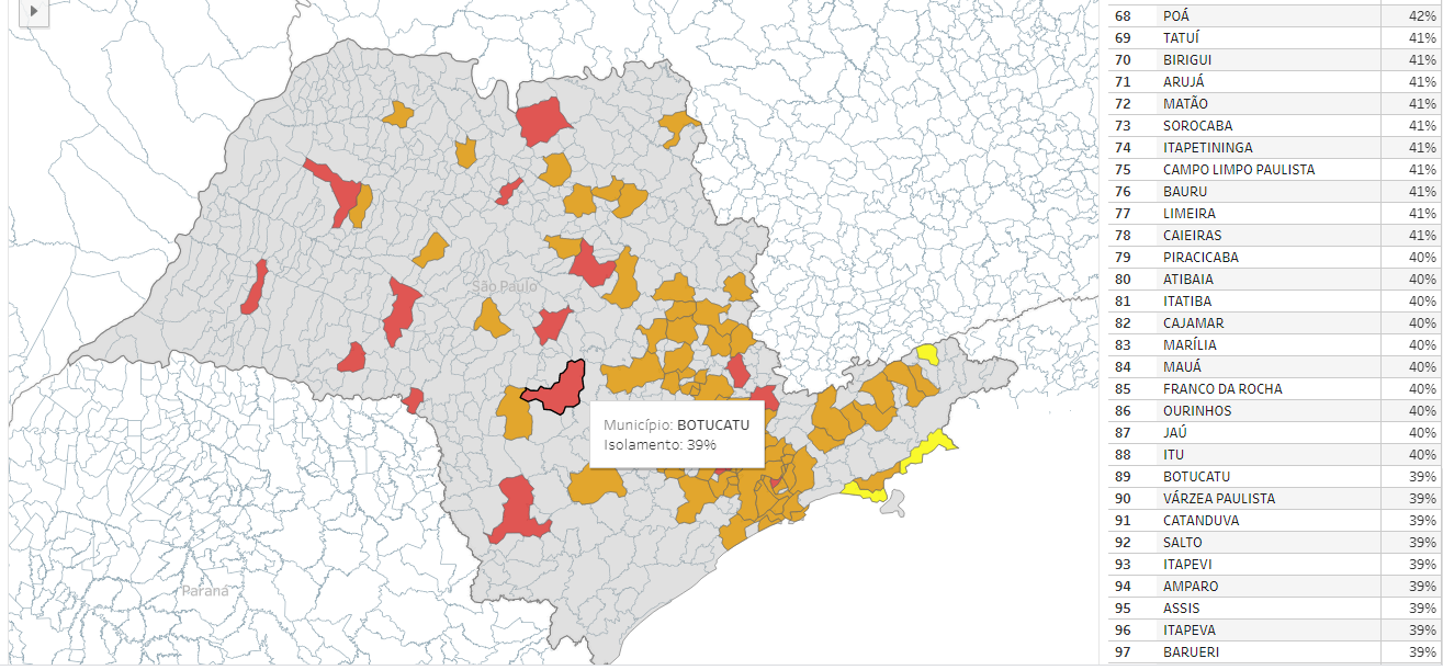 Segundo a Organização Mundial da Saúde (OMS), o índice ideal para se evitar o contágio da covid-19 seria de 70%. Já o governo estadual recomenda que este valor seja igual ou superior a 50%. O isolamento social também é fator preponderante para a classificação no Plano São Paulo, que consiste na flexibilização das atividades econômicas.