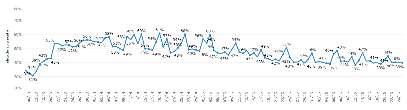 Com o percentual, estima-se que 56.940 botucatuenses fizeram algum tipo de isolamento. O cálculo é feito por base em projeção populacional do Instituto Brasileiro de Geografia e Estatística (IBGE), que aponta 146 mil residentes em Botucatu. A queda iguala o resultado obtido no domingo, 21 de junho, quando também foi de 39%.