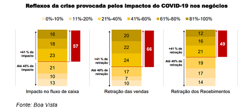Uma pesquisa realizada pela Boa Vista, com micro, pequenos e médios empresários, constatou que 57% das empresas destes portes já sofrem impactos de ao menos 41% no fluxo de caixa por conta da pandemia da Covid-19. Ainda de acordo com o levantamento, feito para identificar as consequências da pandemia para às MPMEs, 66% delas tiveram retrações a partir de 41% em suas vendas, ao passo que pouco menos da metade (49%) teve diminuição de 41% ou mais nos recebimentos dos clientes. Para o estudo, a Boa Vista ouviu 354 micro, pequenos e médios empresários, representantes dos setores da Indústria e do Comércio, em todo o Brasil.