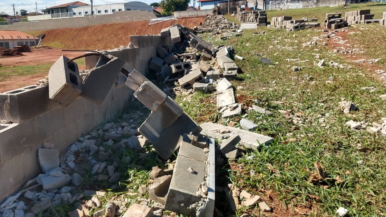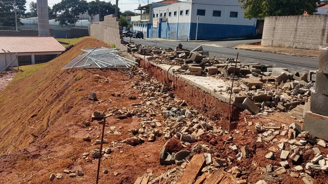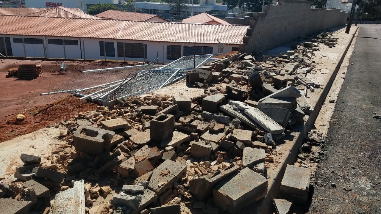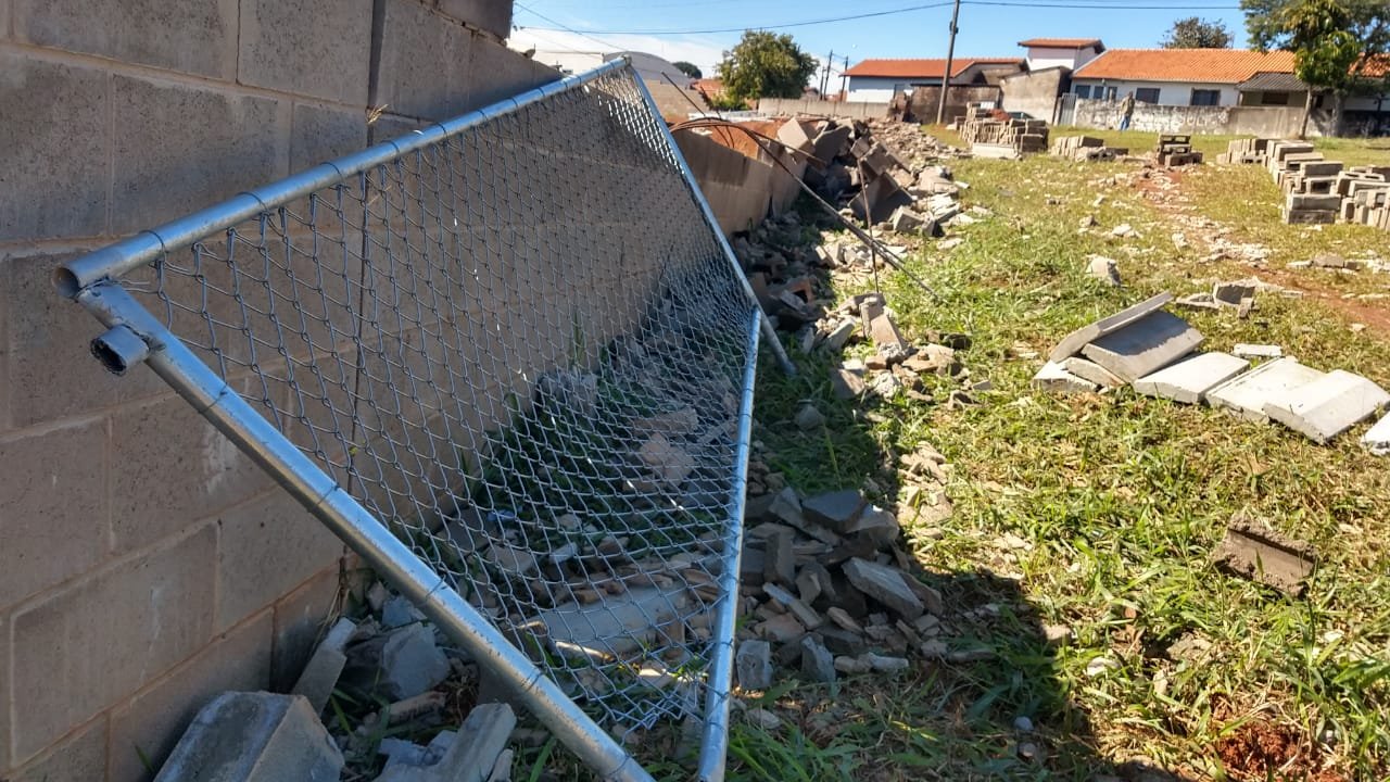 Na parte lateral da escola, os blocos cederam parcialmente e as grades de proteção superior também foram danificadas. Já em outro lado, todo o muro foi abaixo devido a força do vento.