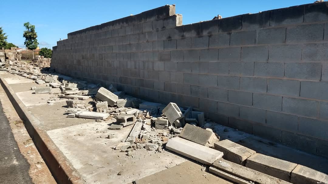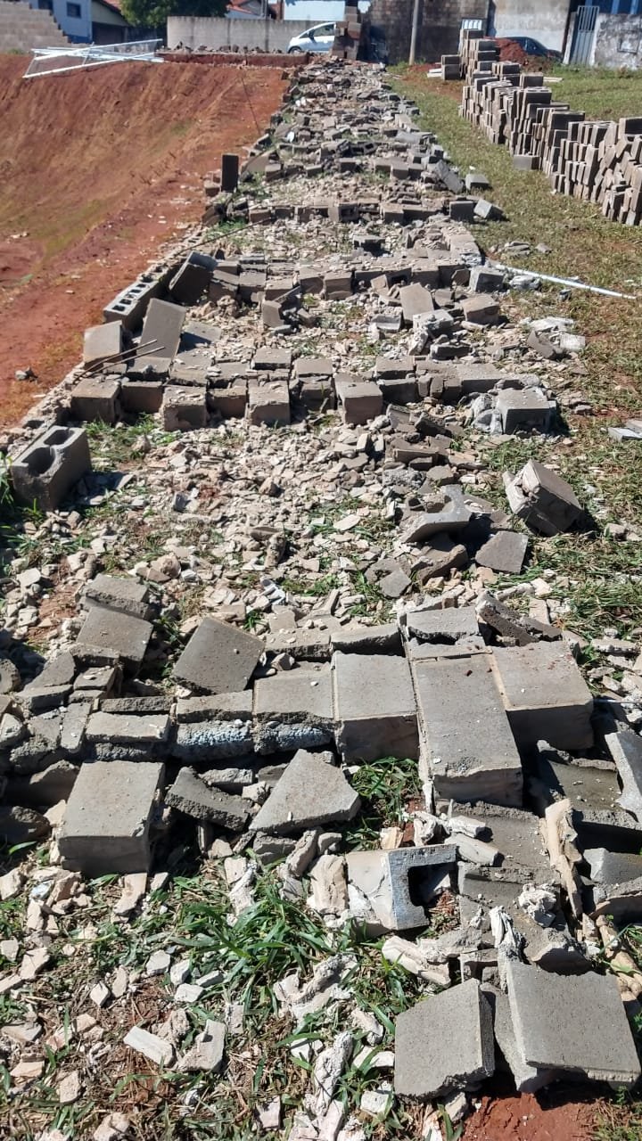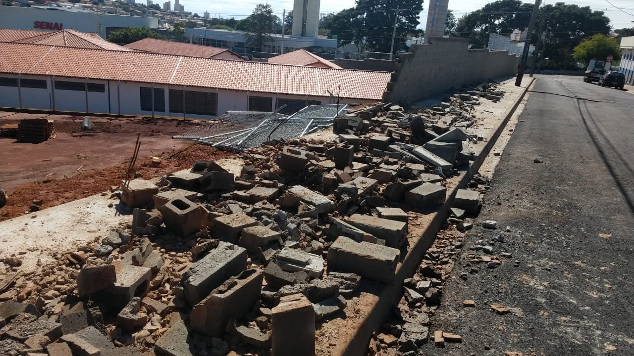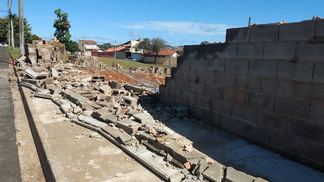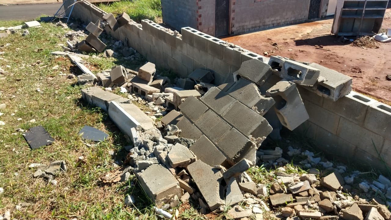 Na parte lateral da escola, os blocos cederam parcialmente e as grades de proteção superior também foram danificadas. Já em outro lado, todo o muro foi abaixo devido a força do vento.