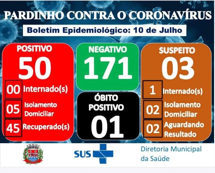 Nesta sexta-feira, 10 de julho, são cinco pardinhenses em isolamento domiciliar para tratamento médico. Ainda há três casos suspeitos sob investigação.