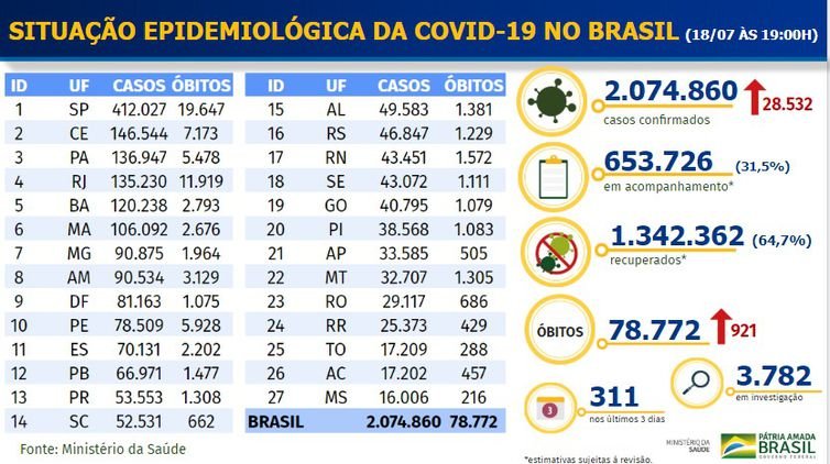 O boletim epidemiológico do Ministério da Saúde, divulgado neste sábado (18) registra 2.074.860 casos registrados de pessoas infectadas pelo novo coronavírus no Brasil desde o início da pandemia. Desse total, mais da metade,1.342.362 pacientes conseguiram se recuperar da covid-19, doença que causou a morte de 78.772 brasileiros.