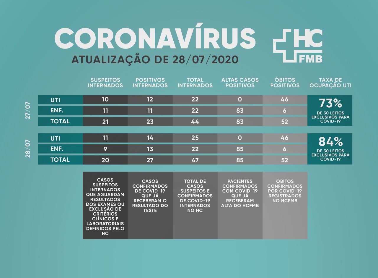 É o maior número desde o início da pandemia e quando a instituição passou a contar com as atuais 30 vagas. Segundo boletim do próprio HCFMB, estão em uso 25 das 30 vagas disponíveis, sendo que são catorze pacientes positivos para o novo coronavírus e onze com sintomas de síndrome gripal e que são suspeitas. Já as enfermarias exclusivas à covid-19 estão com taxa de 22% de ocupação (22 de 100 taxas).